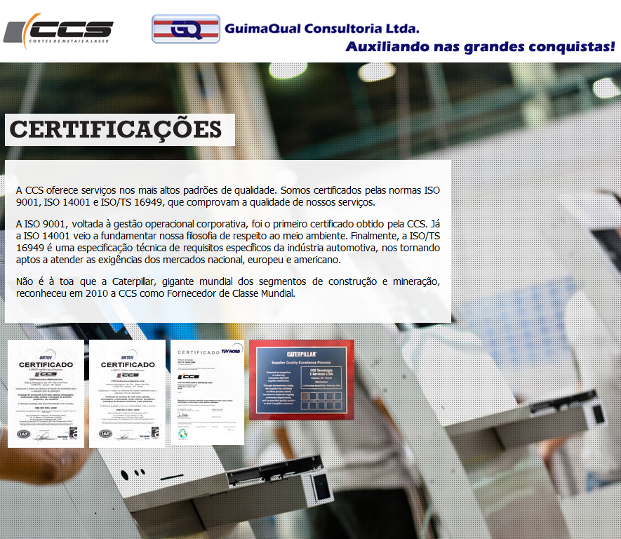 Nos dias 14, 23, 24 e 25 de Novembro de 2011 foram realizadas as auditoria de Manutenção do Sistema de Gestão da Qualidade da CCS Cortes de Metais à Laser, com base nas normas ISO 9001:2008 e ISO TS 16949:2009. As auditorias foram realizadas pelo organismo certificador BR Tuv. O principal objetivo foi aprimorar o desempenho do sistema de gestão da CCS para proporcionar resultados cada vez melhores para seus clientes no que diz respeito a qualidade dos produtos e serviços, do atendimento e da confiabilidade. Mais uma vez a GuimaQual esteve presente nesta conquista!