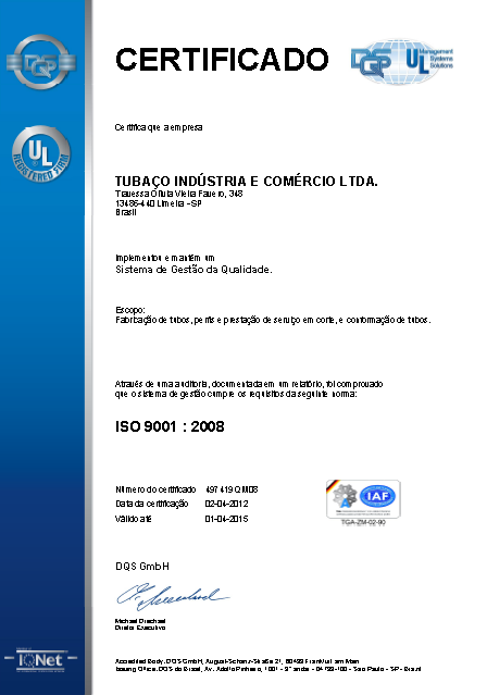 Nos dias 19 e 20 de Março de 2012 foi realizada a auditoria de Certificação do Sistema de Gestão da Qualidade da Tubaço Indústria e Comércio, com base na norma ISO 9001:2008. A auditoria foi realizada pelo organismo certificador DQS.